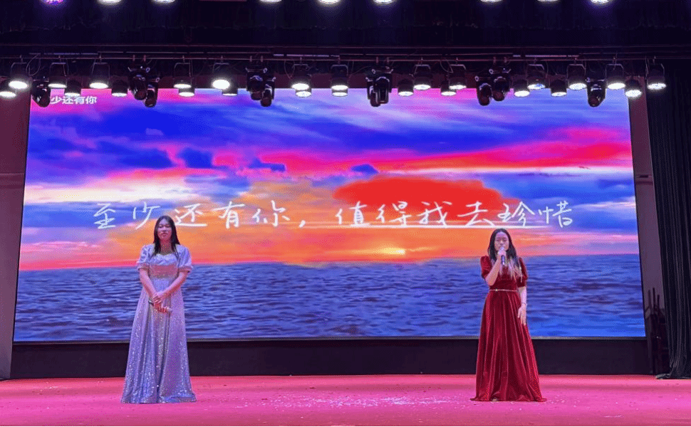 公司刘一童和陈思睿两位女同学联袂演唱《至少还有你》,她们清澈而富有穿透力的嗓音在礼堂中回荡。台下同学们纷举起荧光棒随节奏摇摆,点点星光汇聚成一片璀璨星海,场面温馨而震撼。