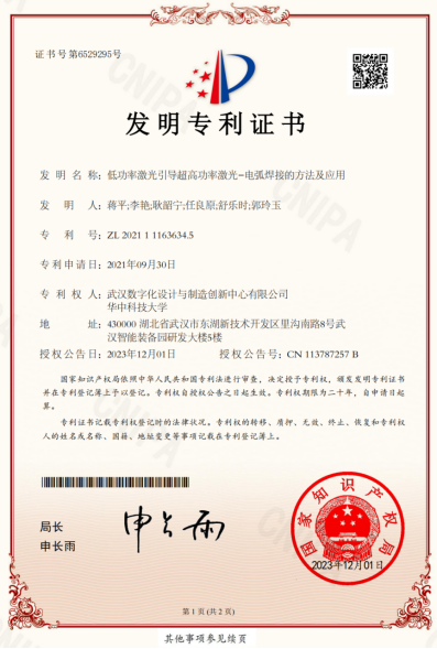 8. 蒋平,李艳,耿韶宁,等.低功率激光引导超高功率激光-电弧焊接的方法及应用,发明专利, ZL 2021 1 1163634.5