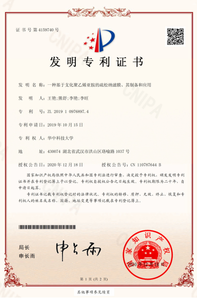 9. 王艳,熊舒,李艳,等.一种基于支化聚乙烯亚胺的疏松纳滤膜、其制备和应用,发明专利, ZL 2019 1 0976897.4